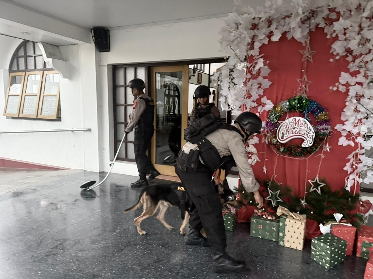 Petugas dari Sat Samapta Polres Banjarnegara memakai atribut lengkap, metal detector, inspection mirror dan anjing pelacak K-9, menyisir halaman gereja, seluruh sudut, serta ruang utama yang akan digunakan untuk perayaan natal.