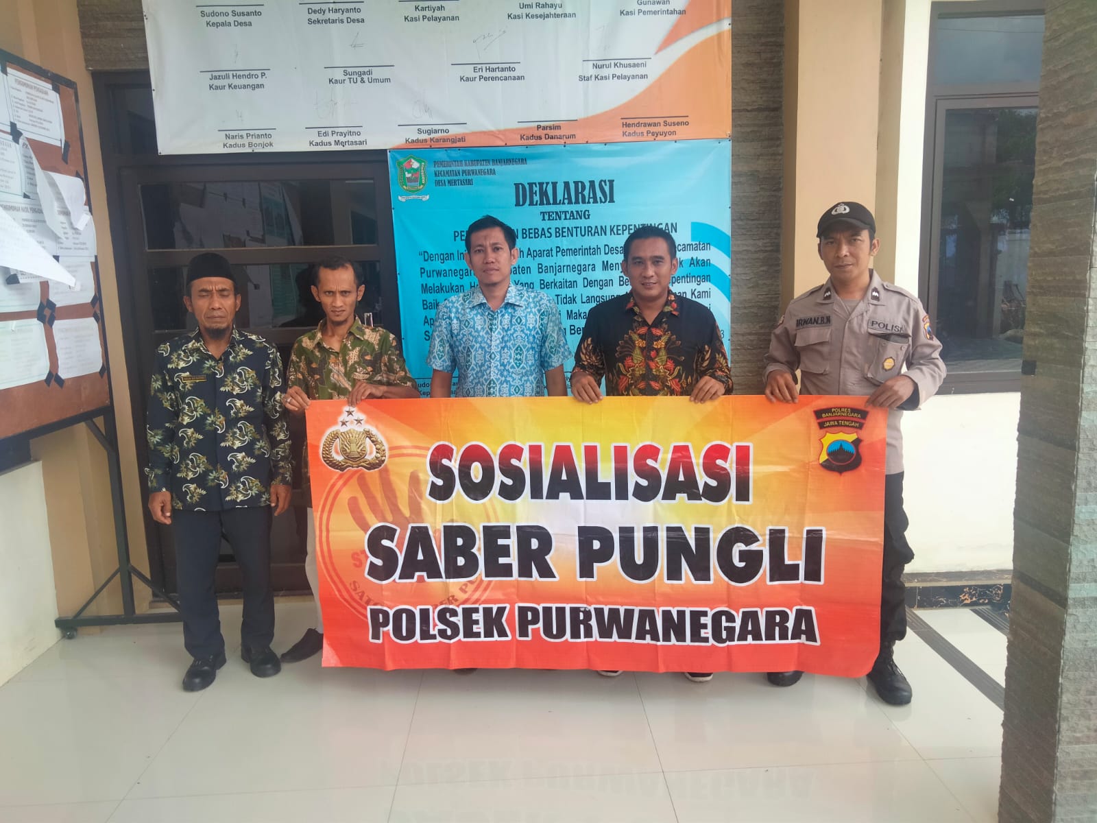 Banjarnegara – Polsek Purwonegoro jajaran Polres Banjarnegara melakulan kegiatan sosialisasi sapu bersih pungutan liar atau saber pungli terhadap perangkat Desa Mertasari dan warga masyarakat Kecamatan Purwonegoro Banjarnegara, Rabu (31/1/2024).
