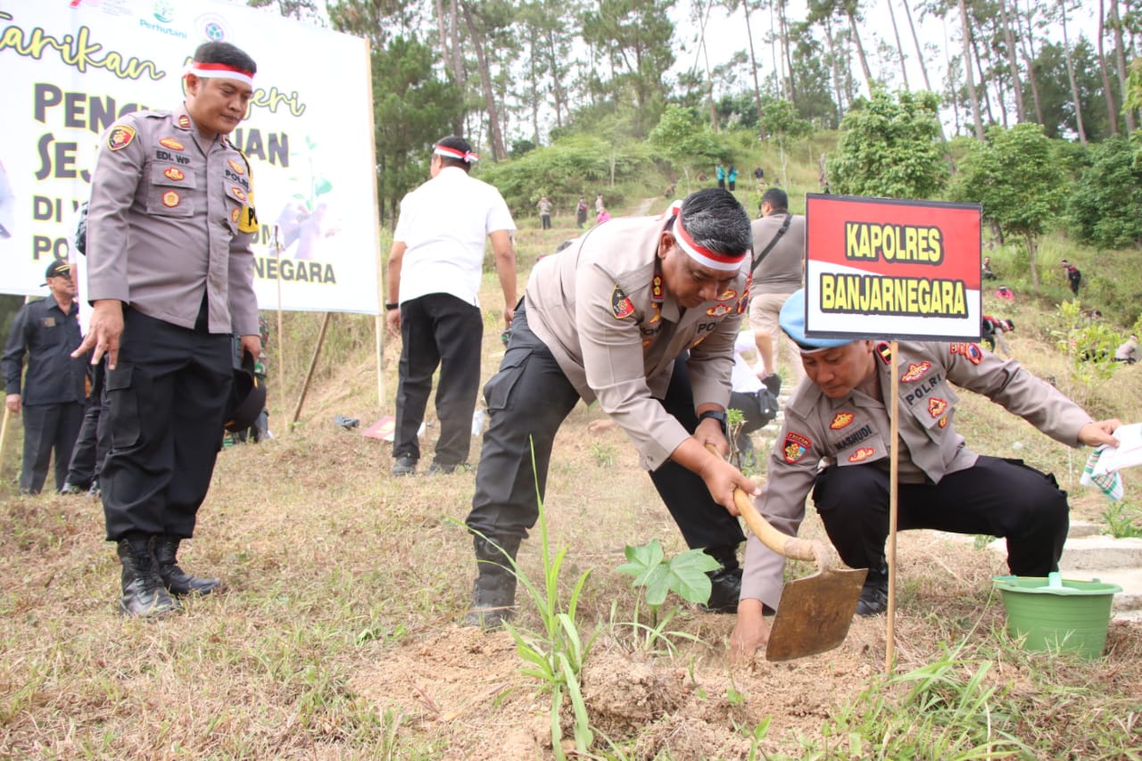 Banjarnegara – Polres Banjarnegara melakukan kegiatan tanam pohon dengan tema “Polri Lestarikan Negeri Penghijauan Sejak Dini” sebanyak 1.500 bibit ditanam di Petak 65 RPH Watubelah BKPH Banjarnegara KPH Kedu Selatan Dusun Kewali Desa Kebondalem Kecamatan Bawang Banjarnegara, Rabu (23/8/2023).