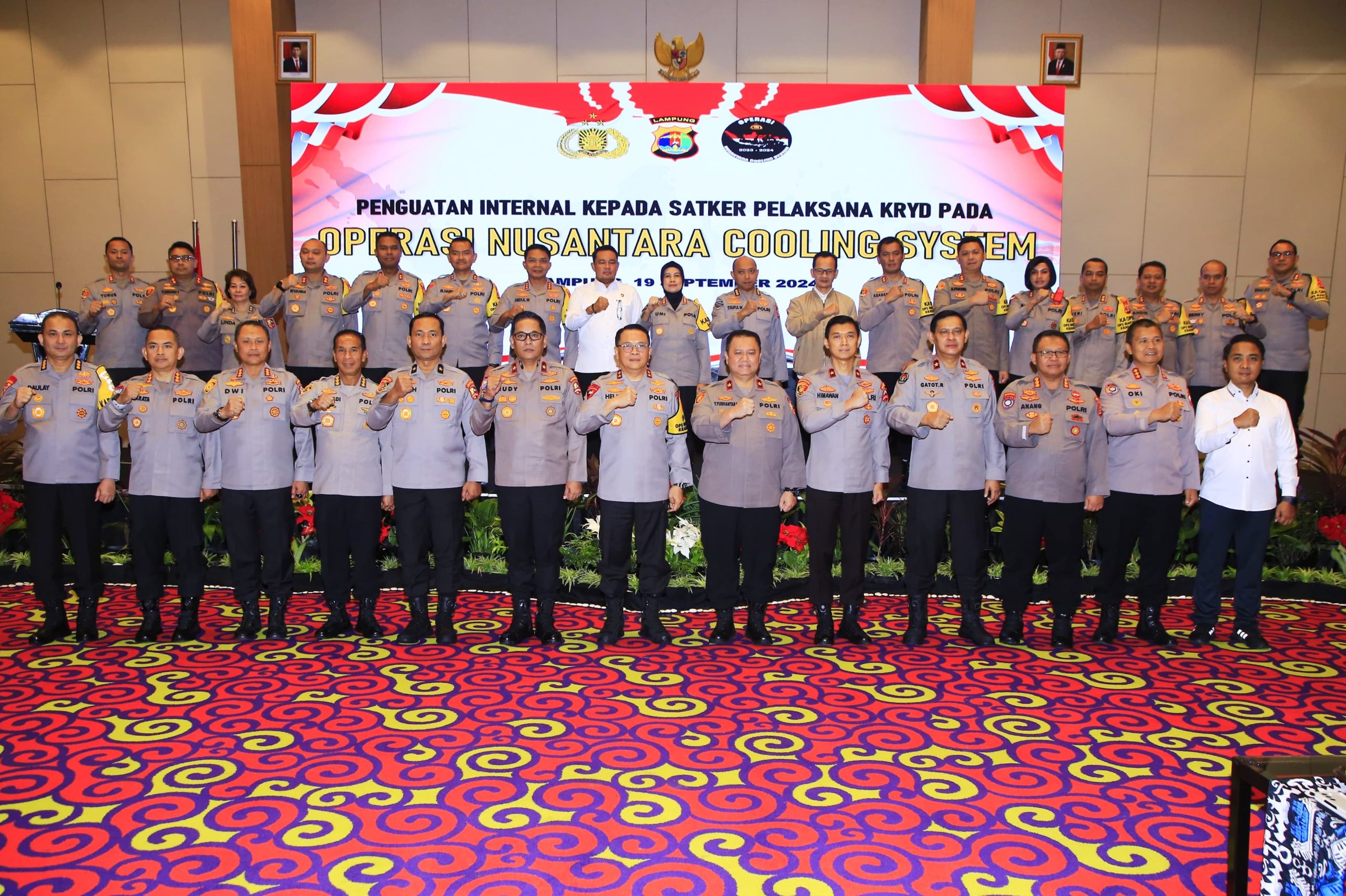 Sebanyak 750 personel mengikuti kegiatan penguatan kepada satker pelaksana kegiatan rutin yang ditingkatkan (KRYD) terkait Nusantara Cooling System di Ballroom Novotel, Bandar Lampung, Kamis (19/9/2024). Turut hadir Kapolda Lampung Irjen Pol Helmy Santika dan seluruh pejabat Utama.