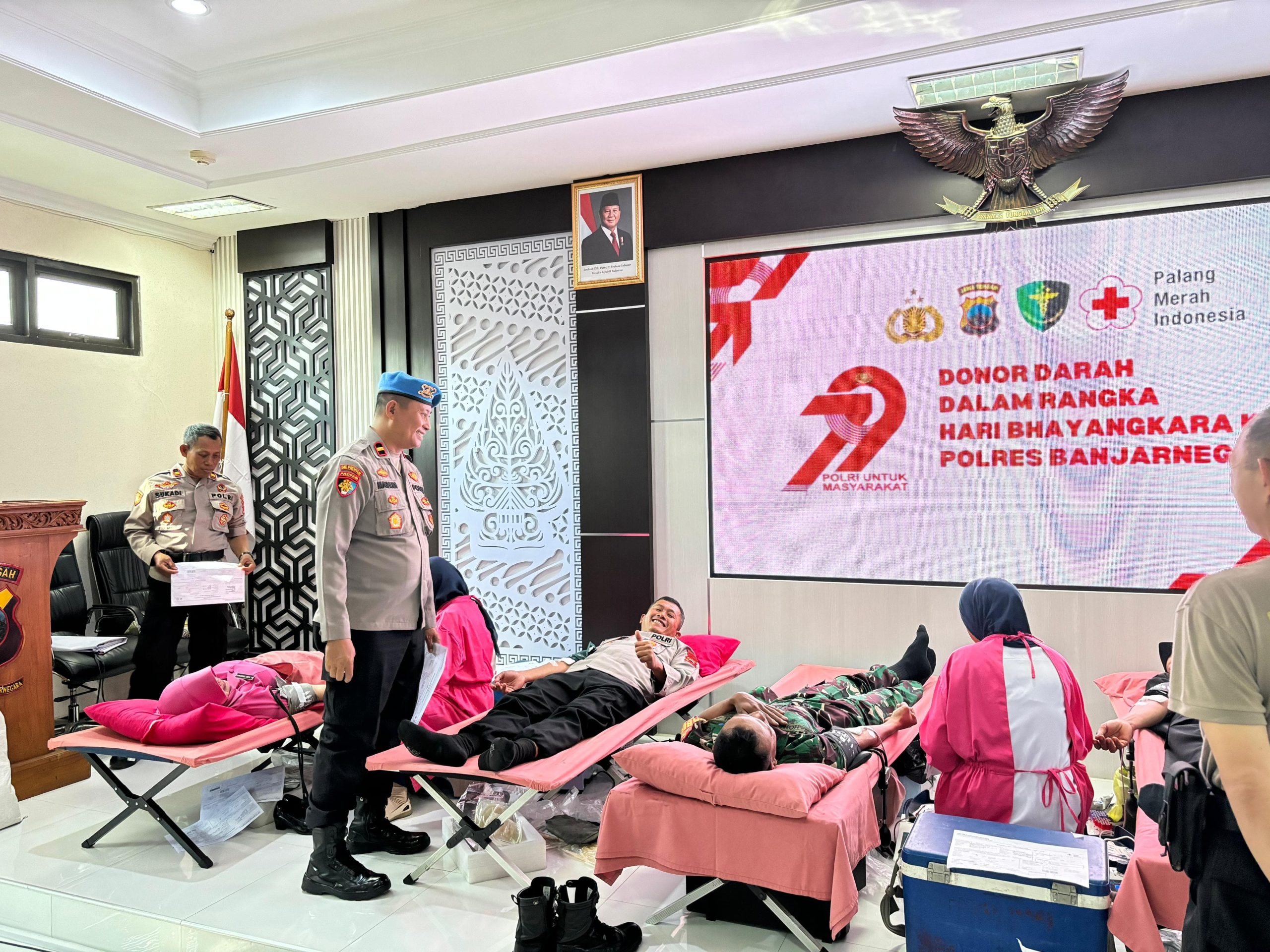Banjarnegara – Polres Banjarnegara menggelar bakti kesehatan donor darah dalam rangka menyambut Hari Bhayangkara Ke-79 pada tanggal 1 Juli 2025 mendatang dengan tema “ Polri untuk Masyarakat”, kegaiatan digelar di Aula Samgraha Marga Rupa Mapolres Banjarnegara, Senin (16/6/2025).